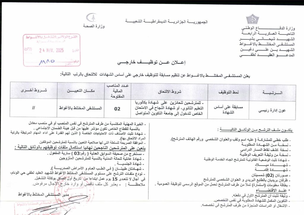 يعلن المستشفى المختلط بالأغواط عن تنظيم مسابقة للتوظيف الخارجي على أساس اختبار مهني للالتحاق بالمناصب التالية: