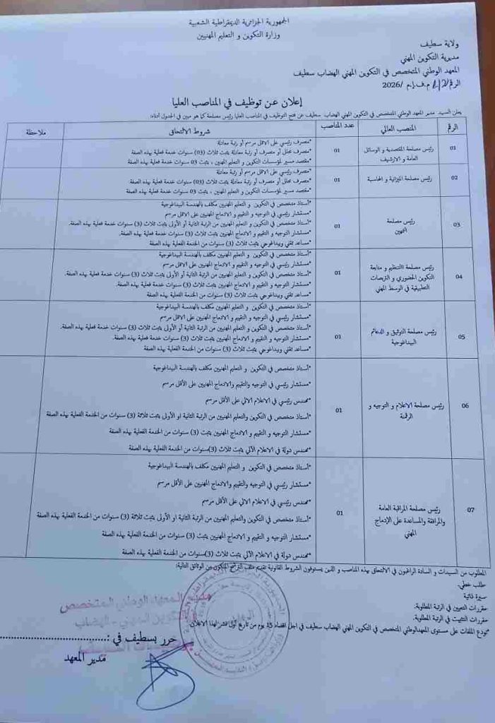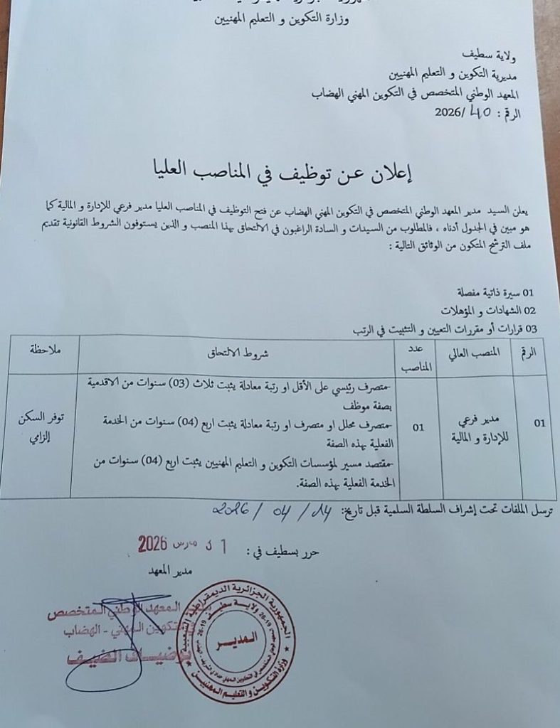 يعلن السيد مدير المعهد الوطني المتخصص في التكوين المهني الهضاب سطيف عن فتح التوظيف في المناصب العليا (رئيس مصلحة) كما هو مبين في الجدول أدناه: