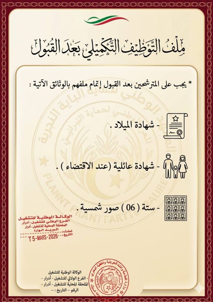ملاحظة في الختم: الوكالة الوطنية للتشغيل – الفرع الولائي أدرار – التاريخ: 15 مارس 2026.