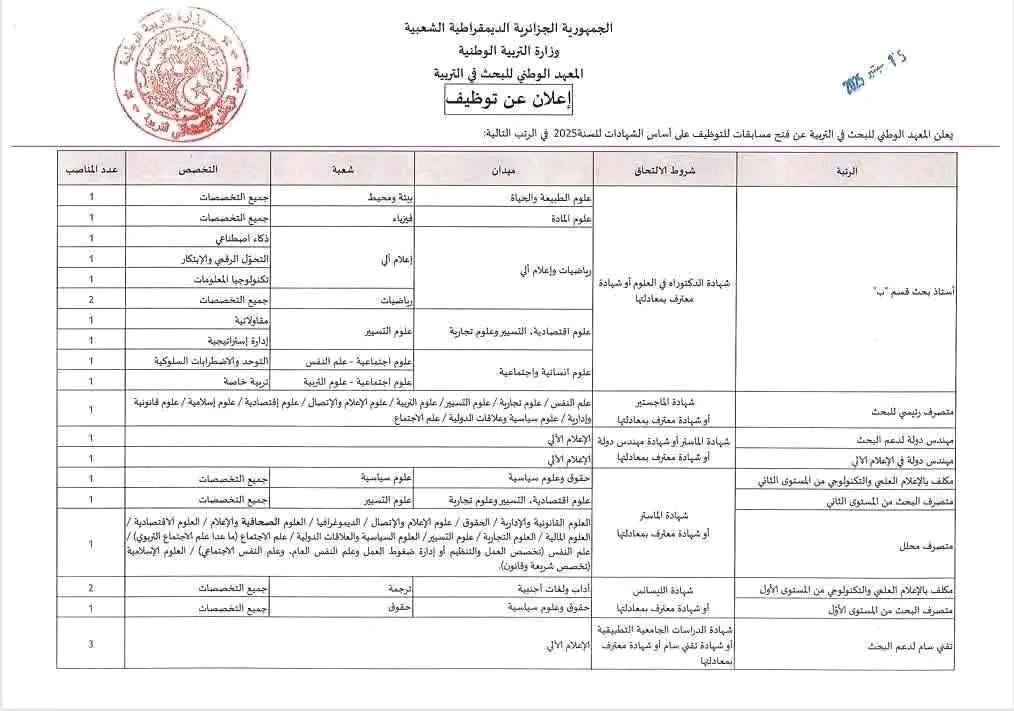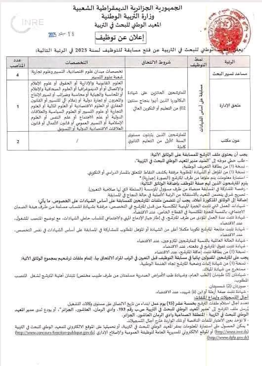 يعلن المعهد الوطني للبحث في التربية (INRE) عن فتح مسابقات للتوظيف على أساس الشهادات لسنة 2025 في الرتب والتخصصات التالية: