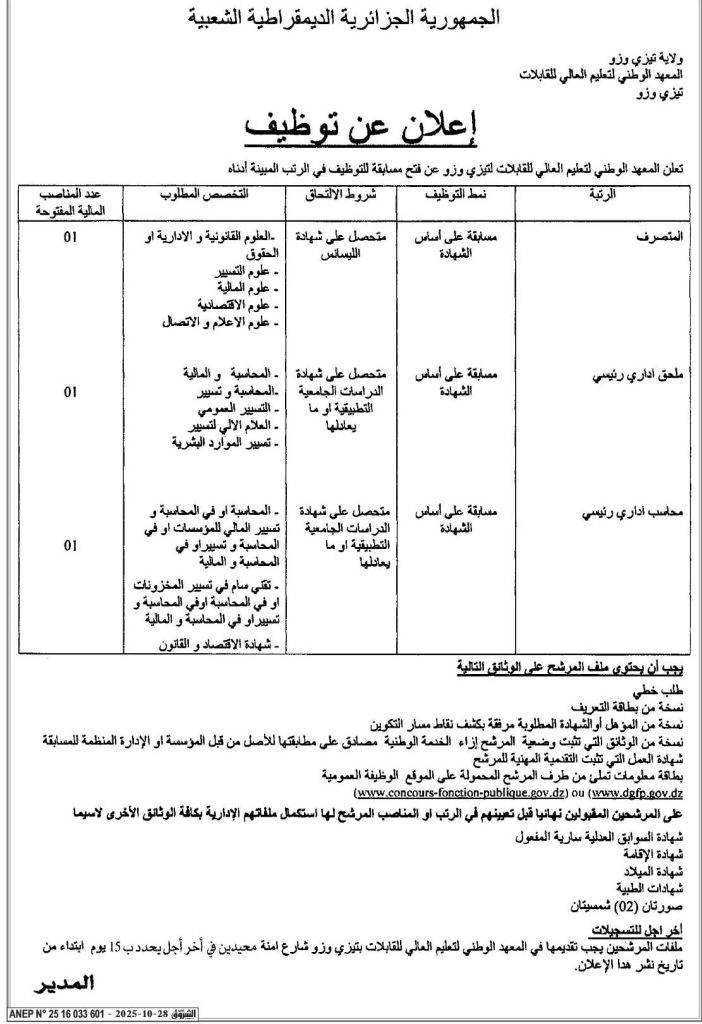 | ملحق إداري رئيسي | مسابقة على أساس الشهادة | – علوم مالية – علوم اقتصادية – علوم الإعلام والاتصال |