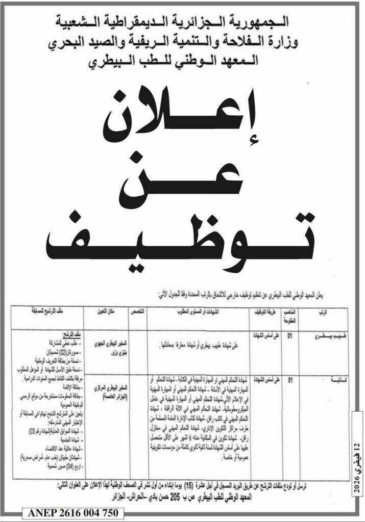 يعلن المعهد الوطني للطب البيطري عن تنظيم مسابقة توظيف خارجي للالتحاق بالرتب المبينة أدناه، وذلك بتاريخ 12 فيفري 2026.