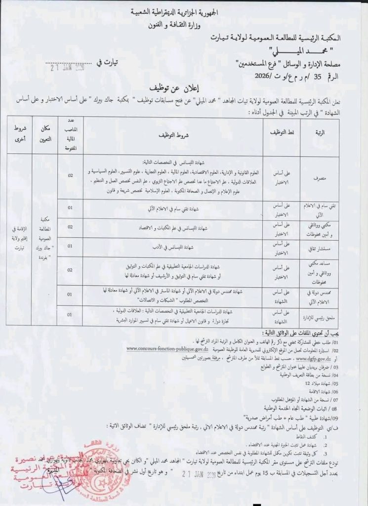 اعلان مسابقة توظيف بالمكتبة الرئيسية للمطالعة العمومية لولاية تيارت