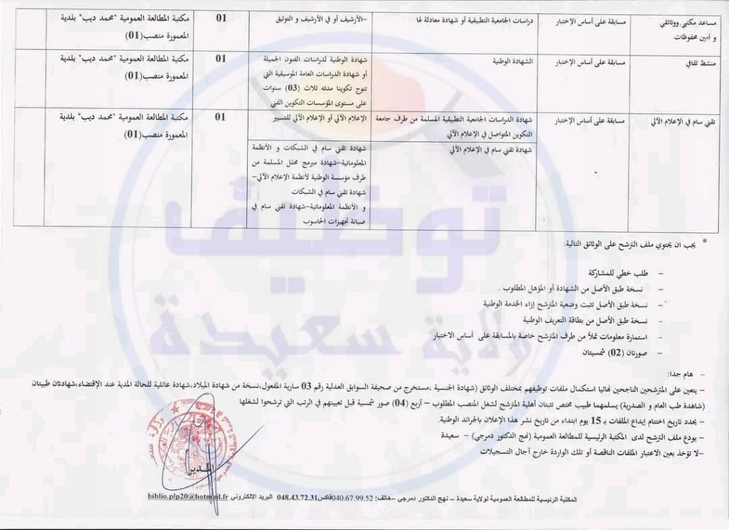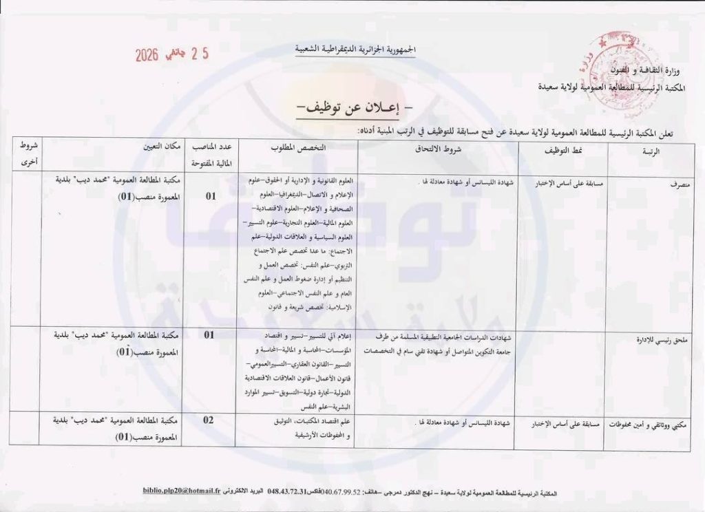 اعلان مسابقة توظيف بالمكتبة الرئيسية للمطالعة العمومية لولاية سعيدة