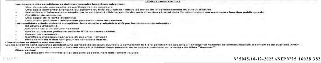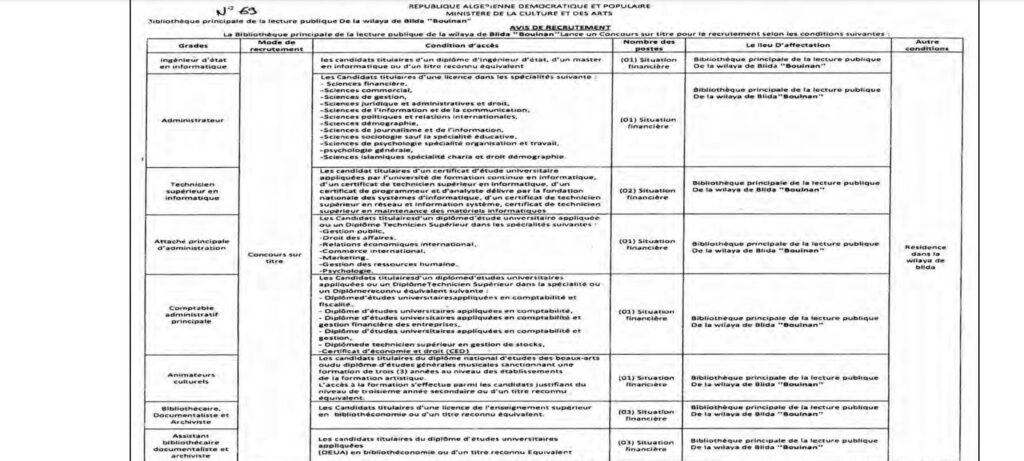 اعلان مسابقة توظيف بالمكتبة الرئيسية للمطالعة العمومية بولاية البليدة