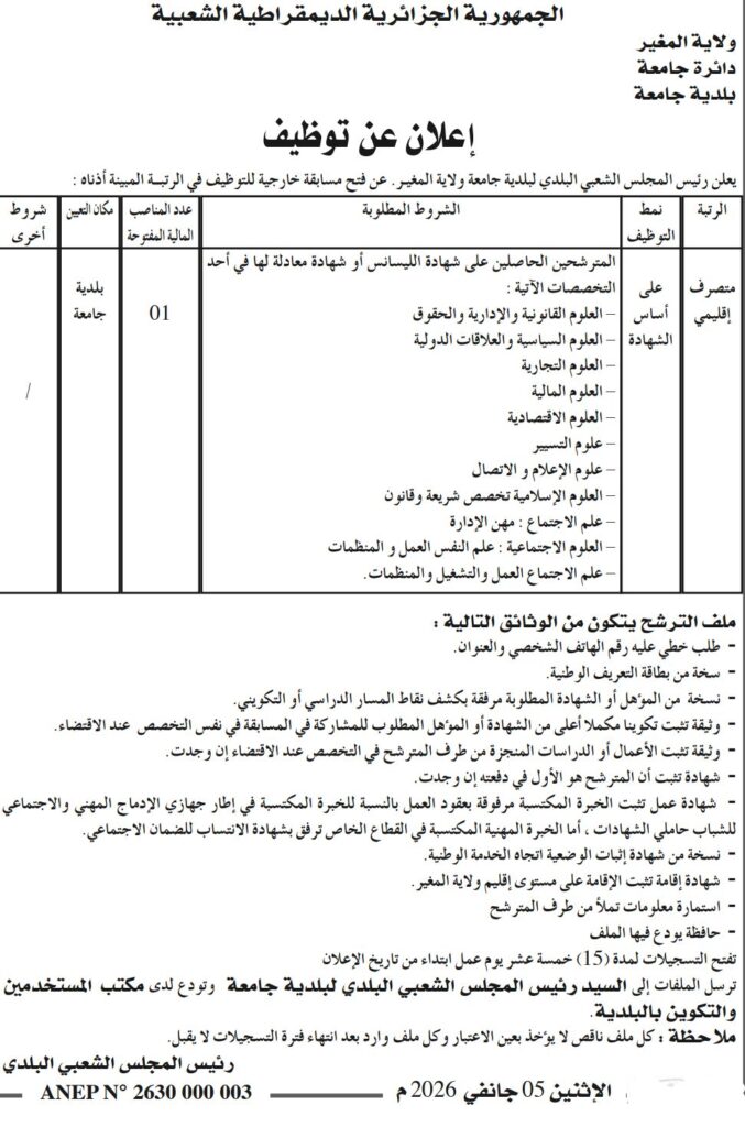 يعلن رئيس المجلس الشعبي البلدي لبلدية جامعة – ولاية المغير عن فتح مسابقة توظيف خارجية على أساس الشهادة للالتحاق بالرتبة المبينة أدناه: