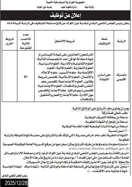 يعلن رئيس المجلس الشعبي البلدي لبلدية عين الملوك عن فتح مسابقة للتوظيف في الرتبة المبينة أدناه: