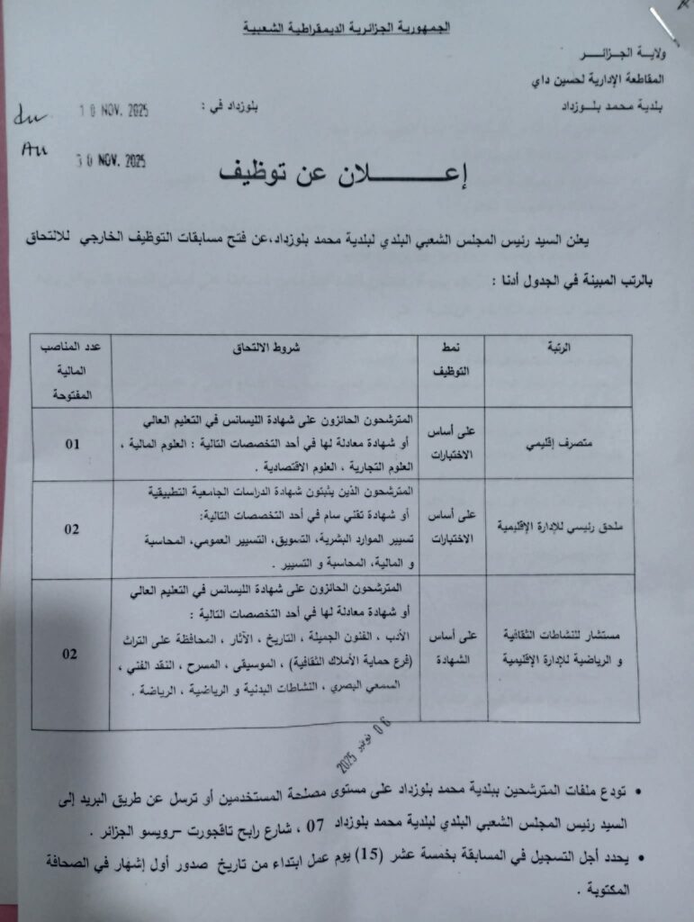 يُعلن السيد رئيس المجلس الشعبي البلدي لبلدية محمد بلوزداد عن فتح مسابقات توظيف خارجي للالتحاق بالرتب المبينة في الجدول أدناه: