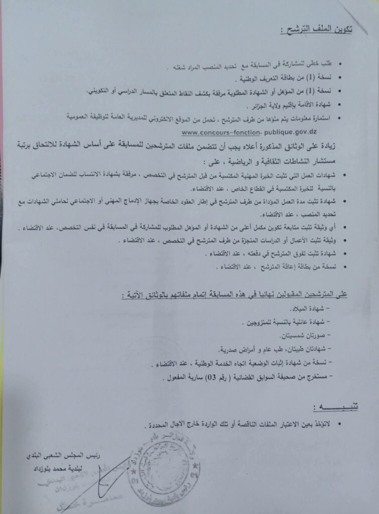 • استمارة معلومات تُملأ من طرف المترشح، تُحمّل من موقع المديرية العامة للوظيفة العمومية:www.concours-fonction-publique.gov.dz
