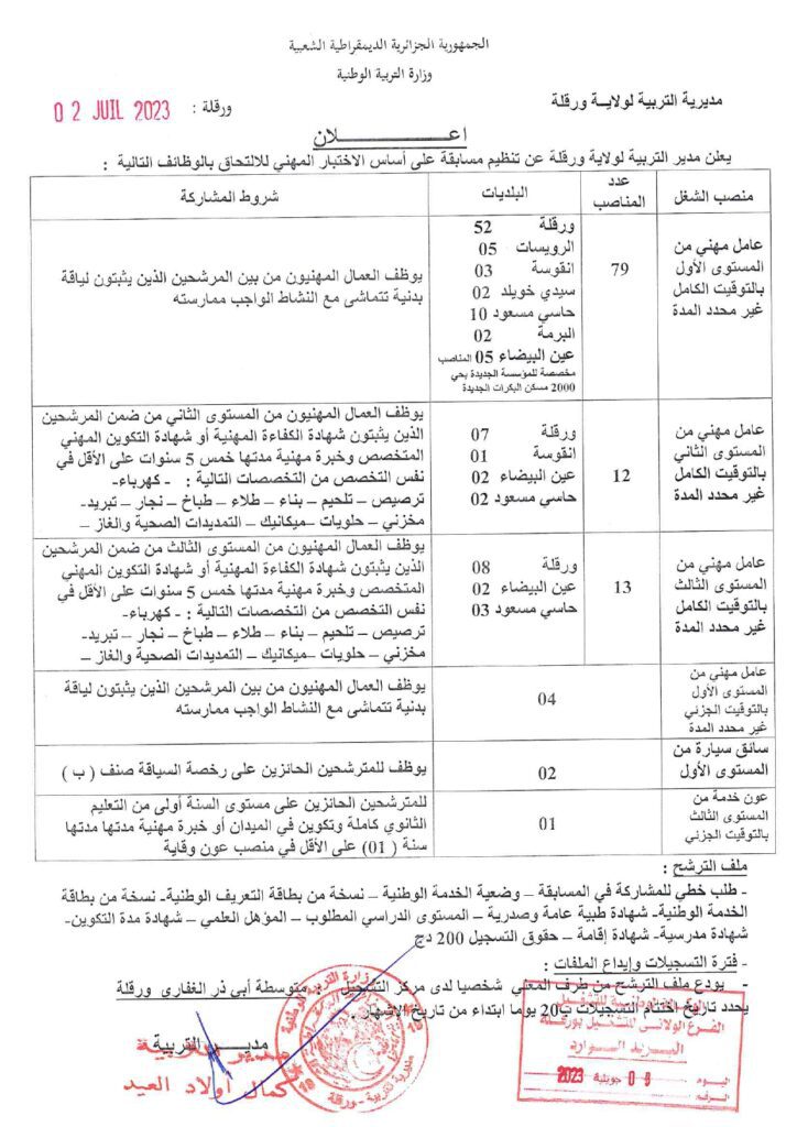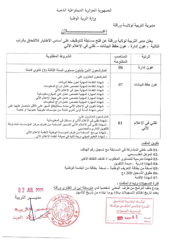 يعلن مدير التربية لولاية ورقلة عن فتح مسابقة للتوظيف على أساس الاختبار وعلى أساس الاختبار المهني في الرتب المبينة