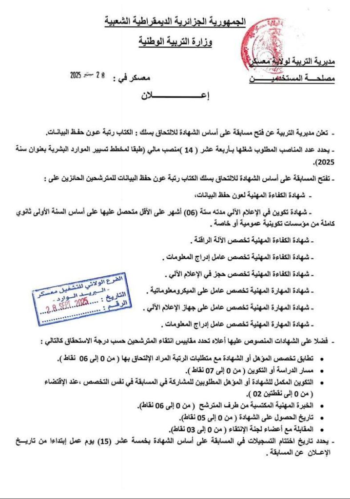 تعلن مديرية التربية لولاية معسكر عن فتح مسابقة توظيف على أساس الشهادة للالتحاق بسلك الكتّاب، رتبة: عون حفظ البيانات، بعنوان السنة المالية 2025.