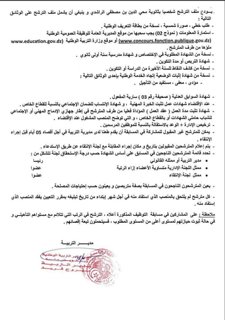 • يمكن للمترشحين غير المقبولين تقديم طعون لدى مديرية التربية في أجل أقصاه 05 أيام قبل إجراء المقابلة.