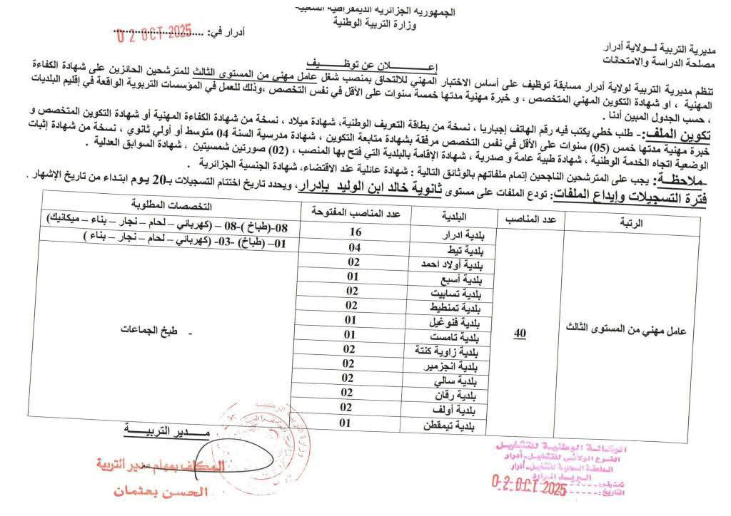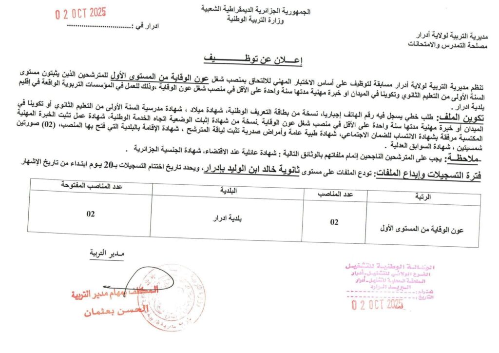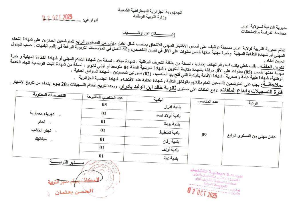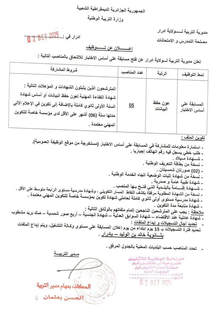 تعلن مديرية التربية لولاية ادرار عن فتح مسابقات توظيف على أساس الاختبار المهني للالتحاق بالرتب التالية