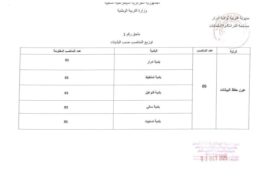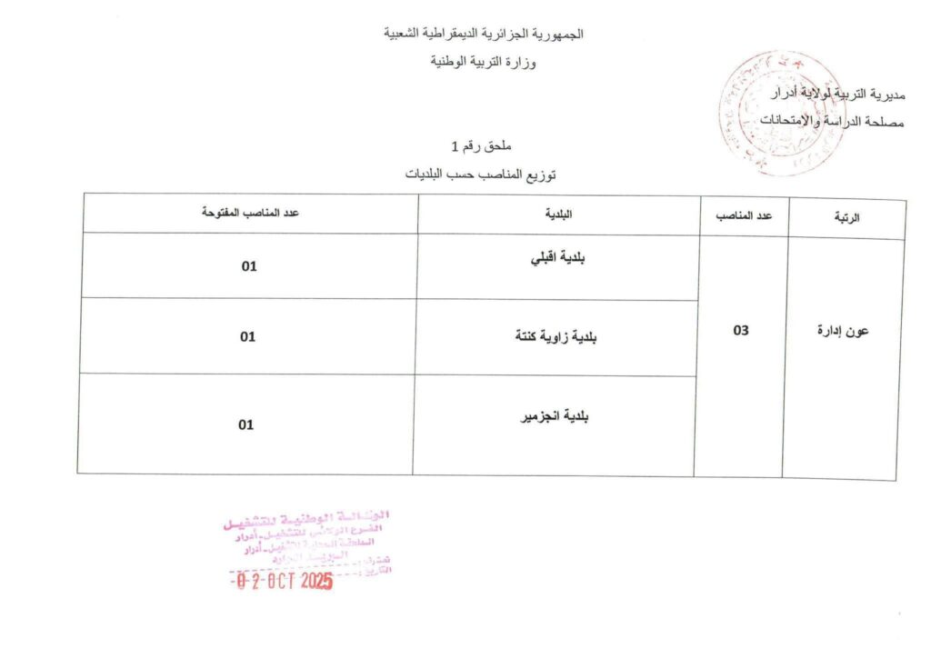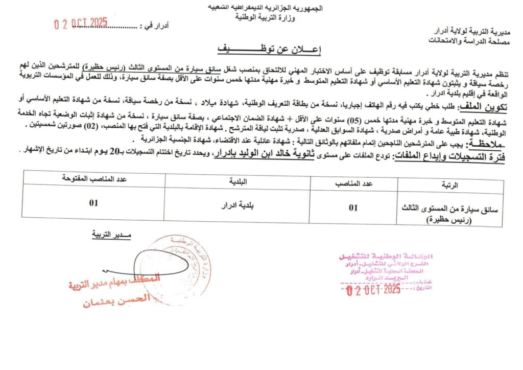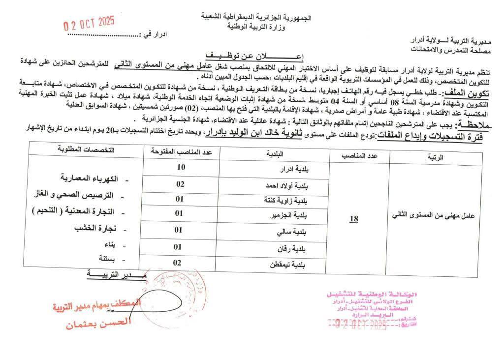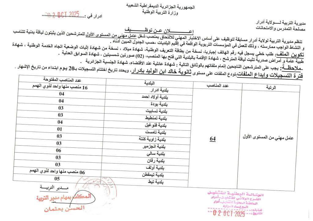 تعلن مديرية التربية لولاية ادرار عن فتح مسابقات توظيف على أساس الاختبار المهني للالتحاق بالرتب التالية