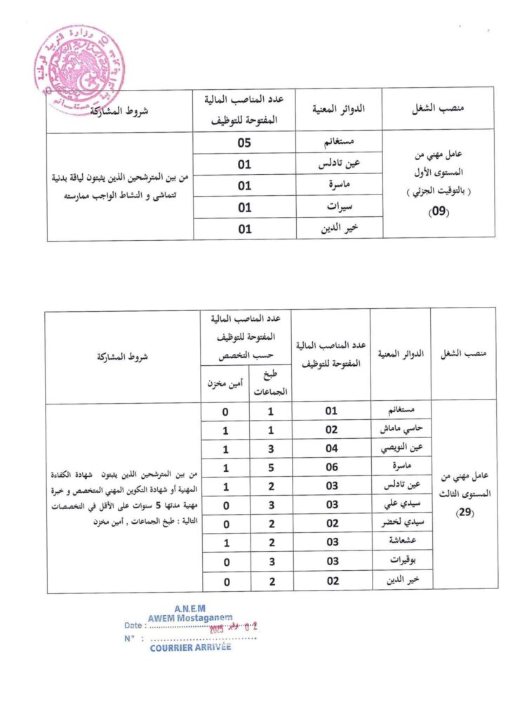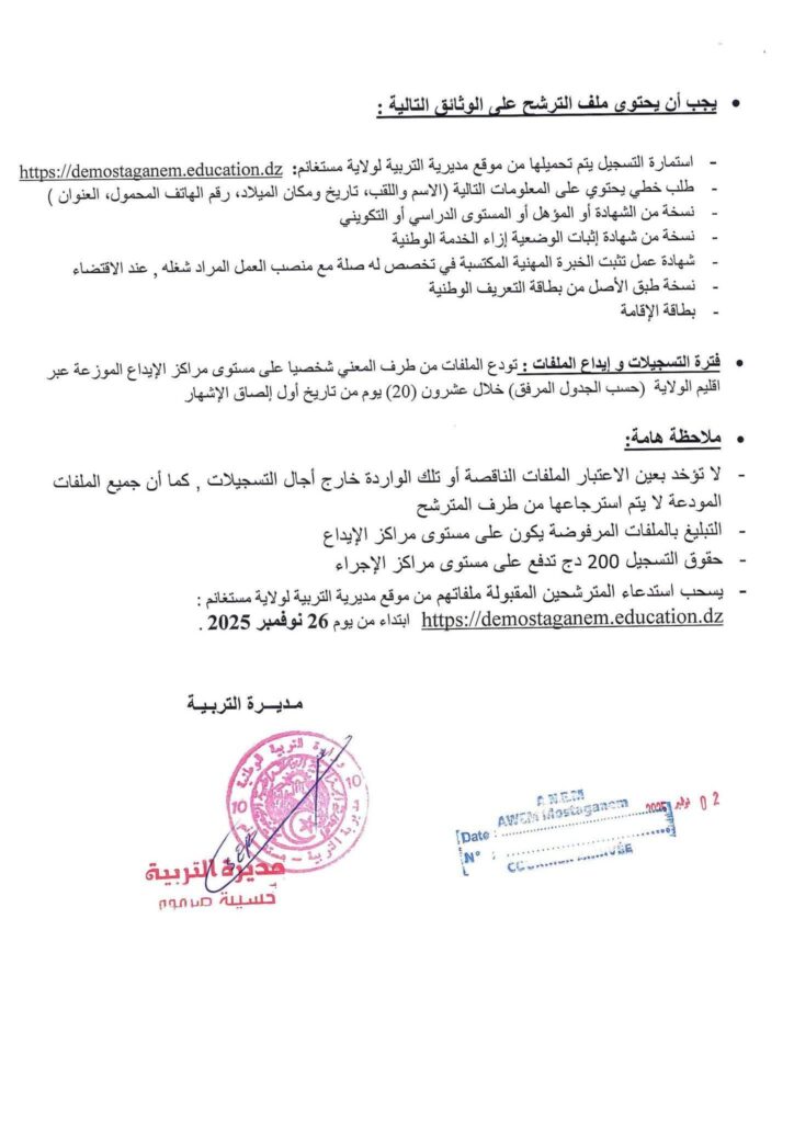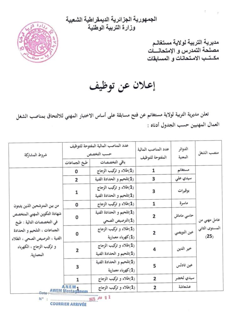 اعلان مسابقة توظيف بمديرية التربية لولاية مستغانم
