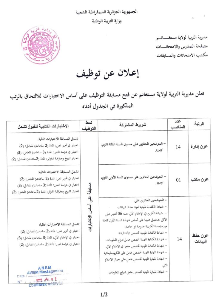 تعلن مديرية التربية لولاية مستغانم عن فتح مسابقة التوظيف على أساس الاختبارات للالتحاق بالرتب التالية