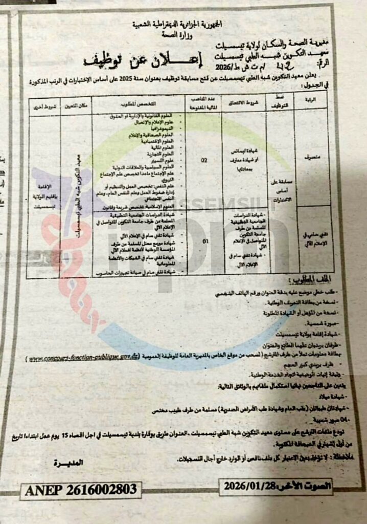 يعلن معهد التكوين شبه الطبي تيسمسيلت عن فتح توظيف بعنوان سنة 2025 على أساس الاختبارات في الرتب التالية: