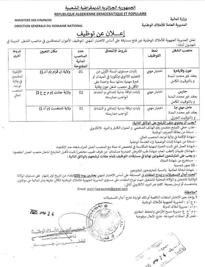 | حارس | اختبار مهني بعقد غير محدد المدة وبالتوقيت الكامل | إثبات لياقة بدنية تتماشى والنشاط الواجب ممارسته | 02 | ولاية جانت (م م ح ع²) | — |