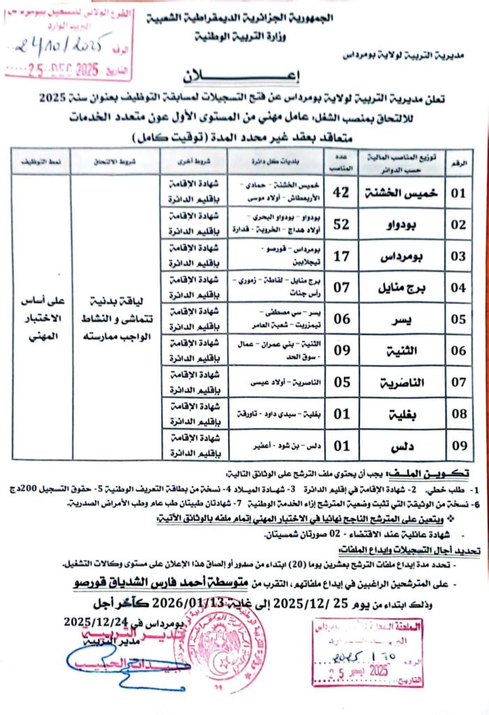 تعلن مديرية التربية لولاية بومرداس عن فتح التسجيلات لمسابقة التوظيف بعنوان سنة 2025 للالتحاق بمنصب: