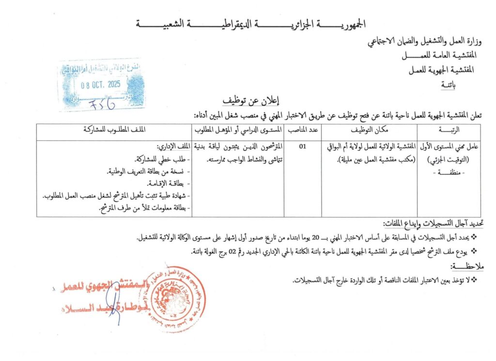 تودع الملفات شخصيًا لدى المفتشية الجهوية للعمل ناحية باتنة – الحي الإداري الجديد رقم 02 – برج الغولة، باتنة.