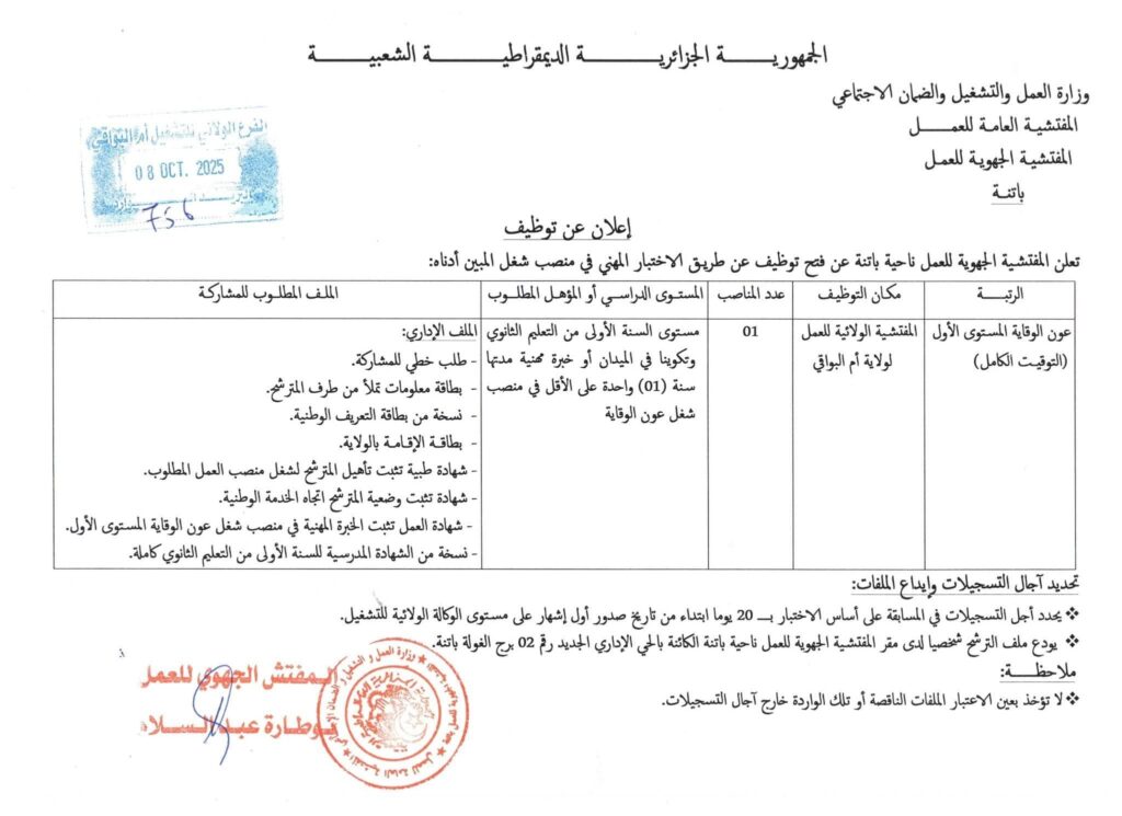 مكان التوظيف: المفتشية الولائية للعمل لولاية أم البواقي (مكتب مفتشية العمل – عين مليلة)