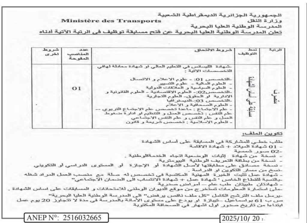 تعلن المدرسة الوطنية العليا البحرية عن فتح مسابقة توظيف على أساس الشهادة في الرتبة التالية: