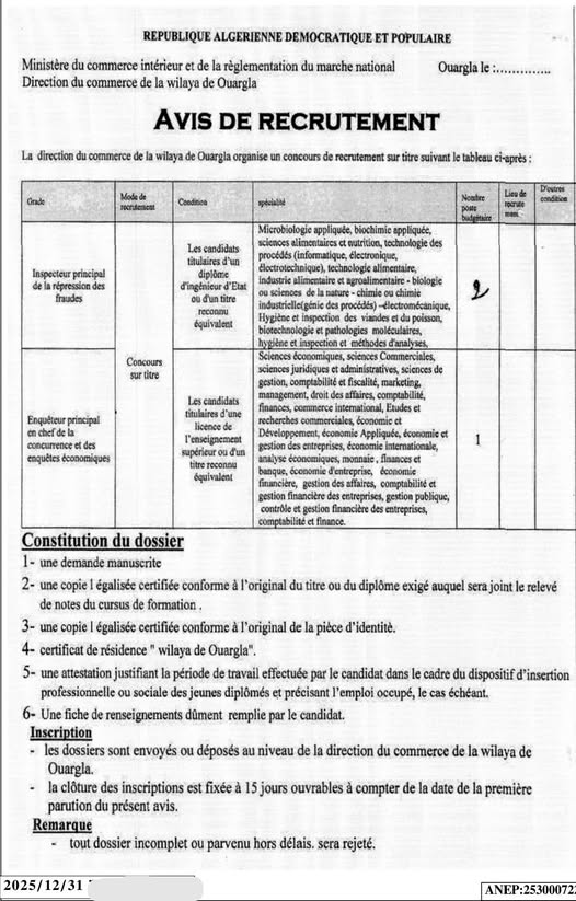 اعلان مسابقة توظيف على أساس الشهادة في مديرية التجارة لولاية ورقلة