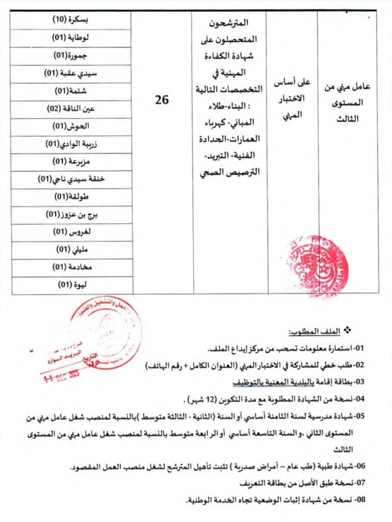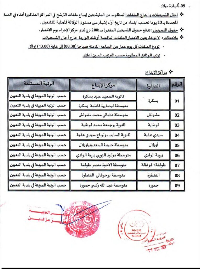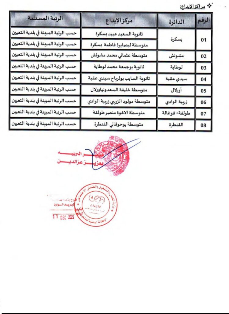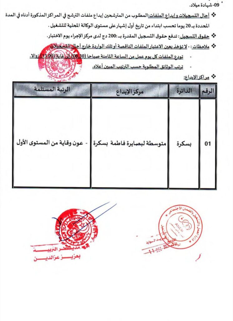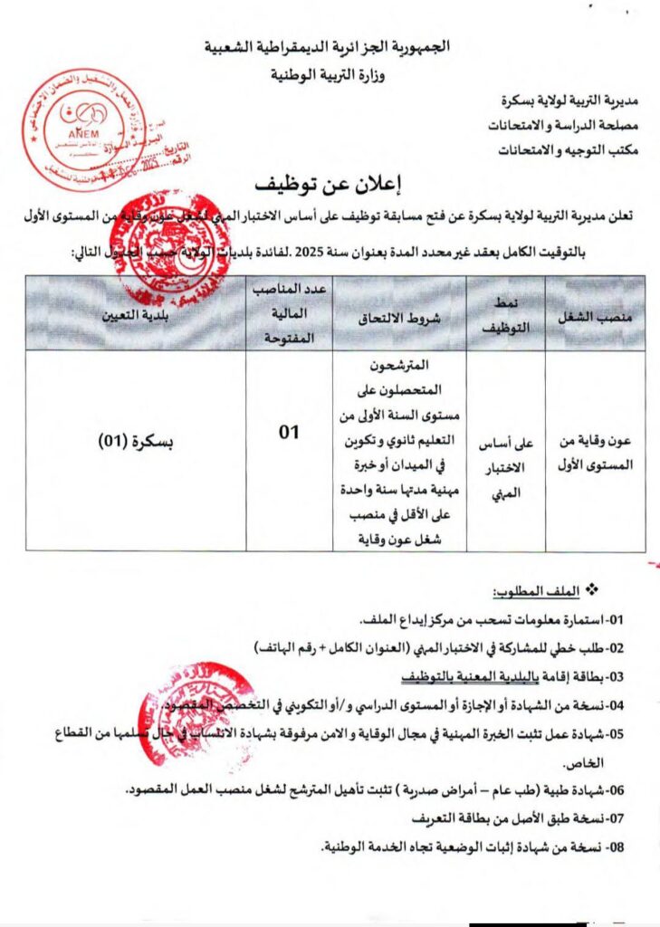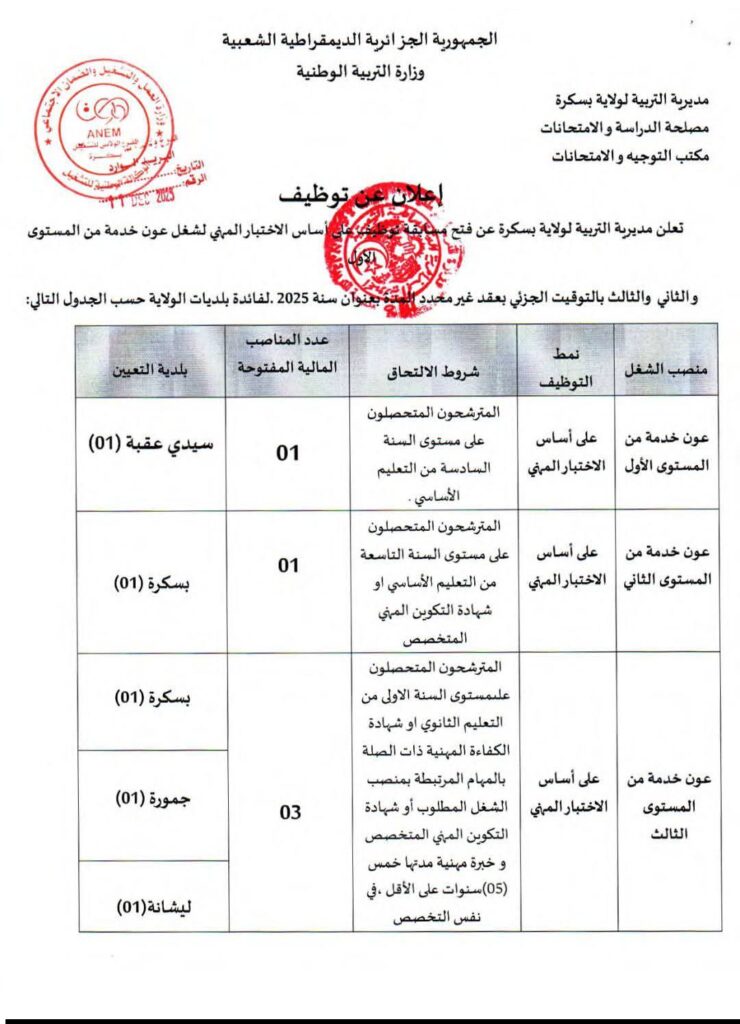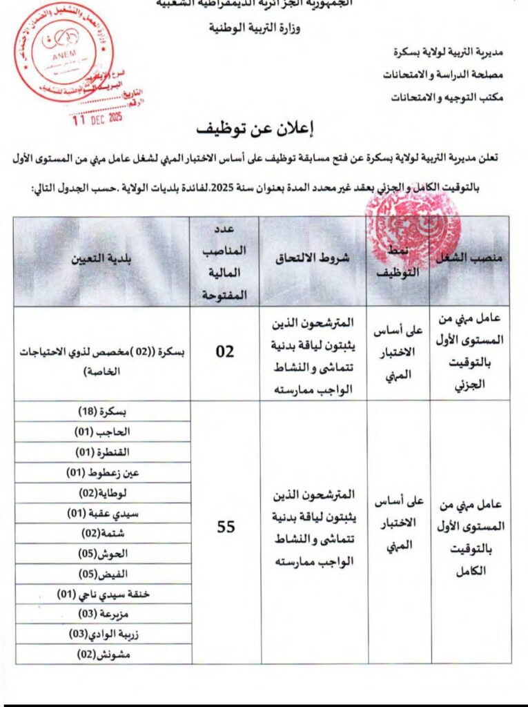 تعلن مديرية التربية لولاية بسكرة عن فتح مسابقات توظيف لفائدة بلديات المذكورة