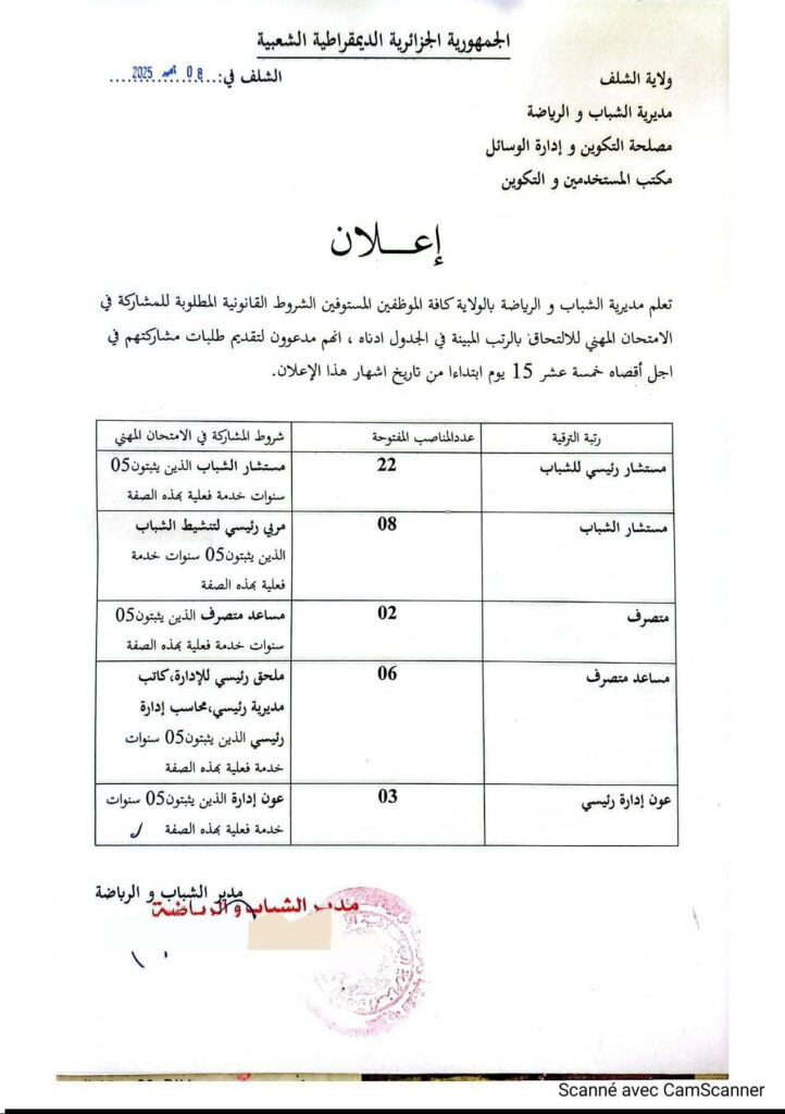 تعلم مديرية الشباب والرياضة لولاية الشلف كافة الموظفين المستوفين للشروط القانونية المطلوبة للمشاركة في الامتحان المهني للترقية في الرتب المبينة في الجدول أدناه، أنهم مدعوون لتقديم طلبات المشاركة في أجل أقصاه خمسة عشر (15) يومًا ابتداءً من تاريخ إشهار هذا الإعلان.