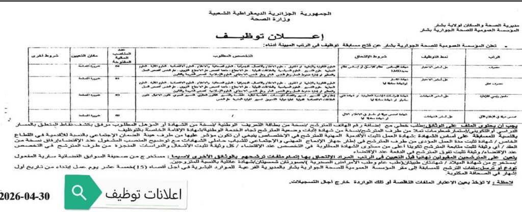 اعلان مسابقة توظيف في المؤسسة العمومية للصحة الجوارية ببشار