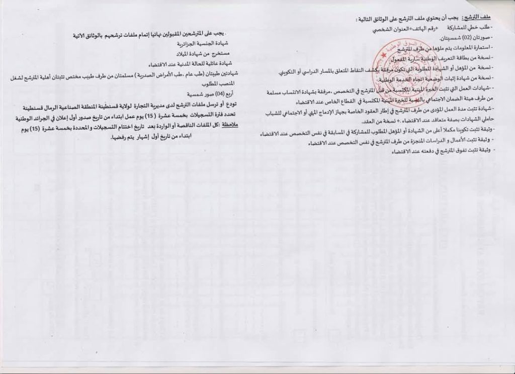مكان التعيين: مقر المديرية أو المفتشيات الإقليمية للتجارة، ولاية قسنطينة