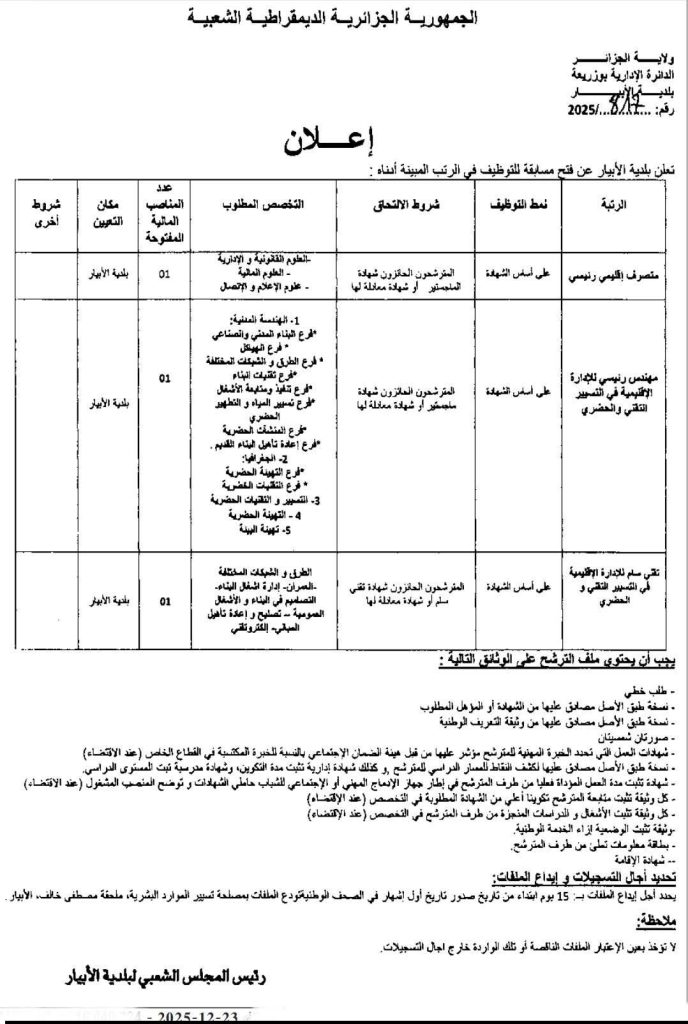 تعلن بلدية الأبيار عن فتح مسابقة للتوظيف في الرتب المبينة أدناه، وفق الشروط والتخصصات المحددة:
