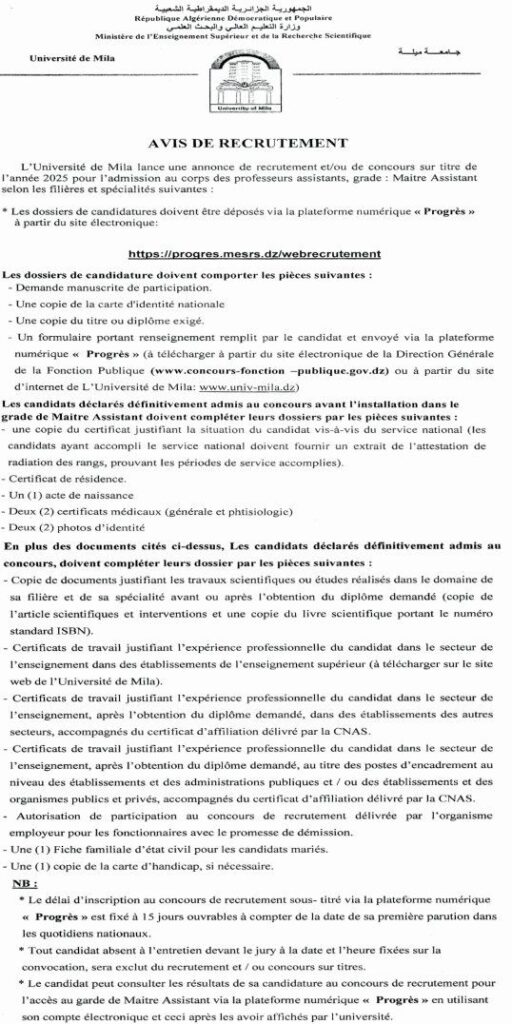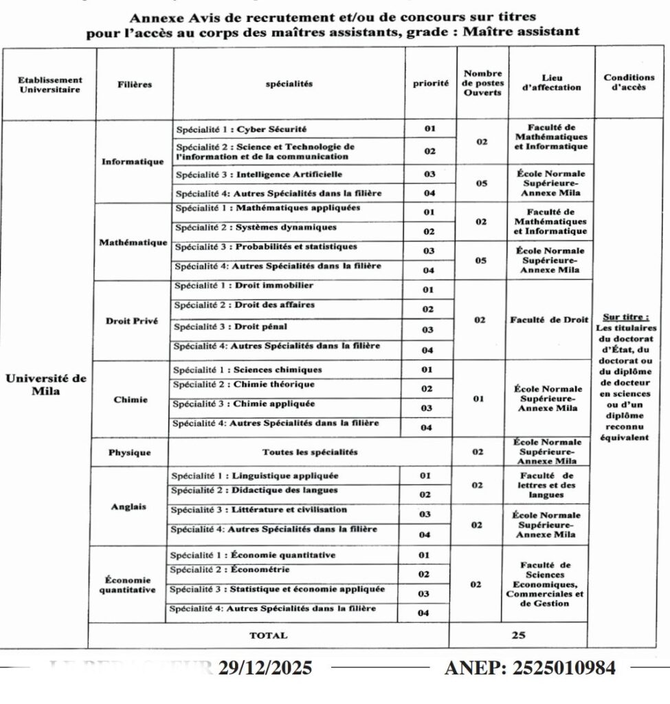تعلن جامعة ميلة عن فتح توظيف و/أو مسابقة على أساس الشهادة بعنوان سنة 2025، للالتحاق بسلك الأساتذة المساعدين، رتبة أستاذ مساعد، وذلك حسب الشعب والتخصصات المبينة في الجدول الملحق بهذا الإعلان.