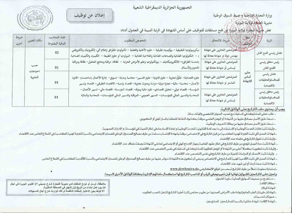 تعلن مديرية التجارة لولاية البويرة عن فتح مسابقات للتوظيف على أساس الشهادة في الرتب المبينة أدناه: