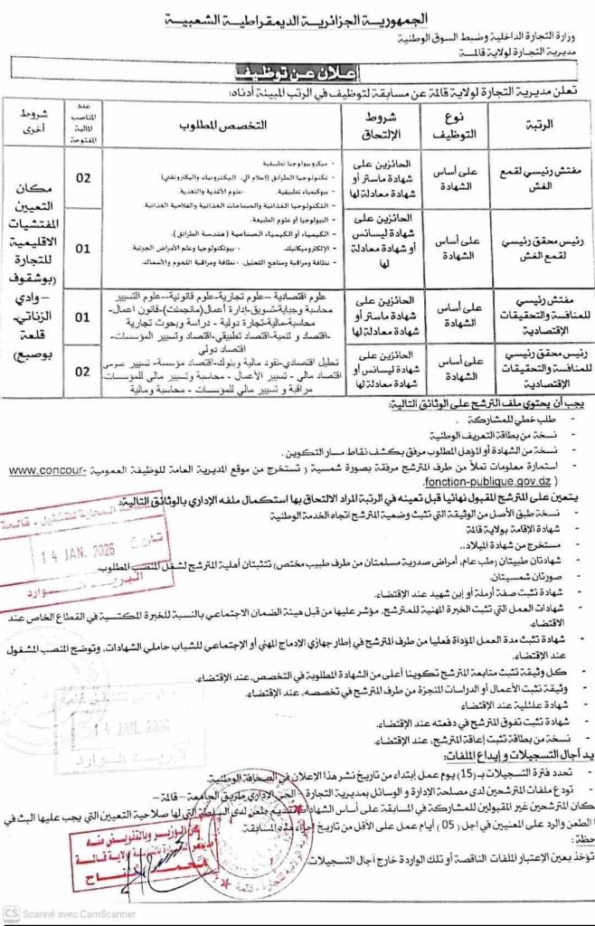 تعلن مديرية التجارة لولاية قالمة عن فتح مسابقة توظيف على أساس الشهادة في الرتب التالية: