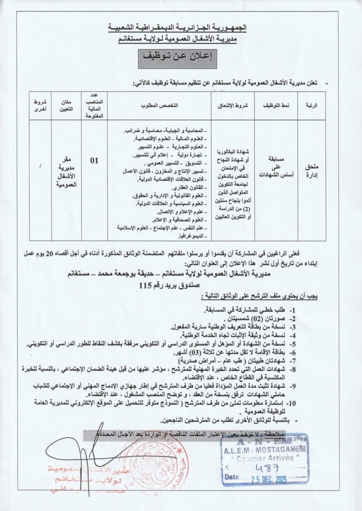 تعلن مديرية الأشغال العمومية لولاية مستغانم عن تنظيم مسابقة توظيف وفق التفاصيل التالية: