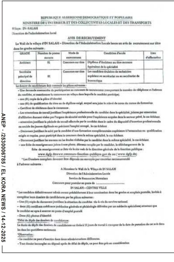 اعلان مسابقة توظيف في مديرية الإدارة المحلية لولاية عين صالح