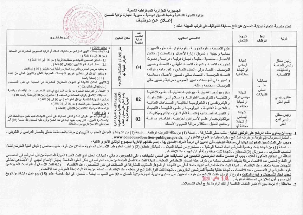 تعلن مديرية التجارة لولاية تلمسان عن فتح مسابقة للتوظيف في الرتب المبينة أدناه: