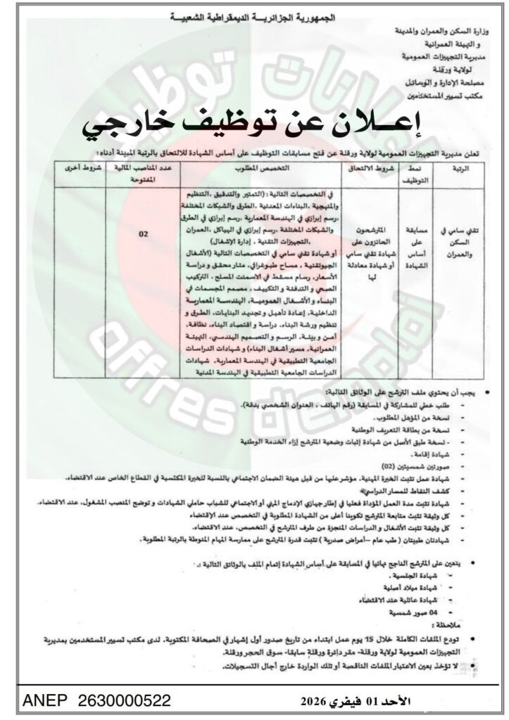 تعلن مديرية التجهيزات العمومية لولاية ورقلة عن فتح مسابقة للتوظيف على أساس الشهادة للالتحاق بالرتبة المبينة أدناه:
