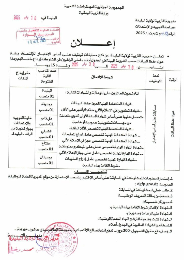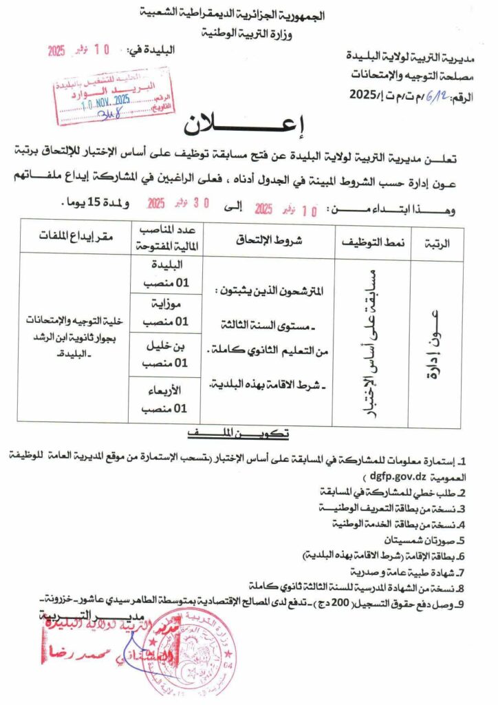 تعلن مديرية التربية لولاية البليدة عن فتح مسابقات توظيف على أساس الاختبار، للالتحاق بالرتب التالية: