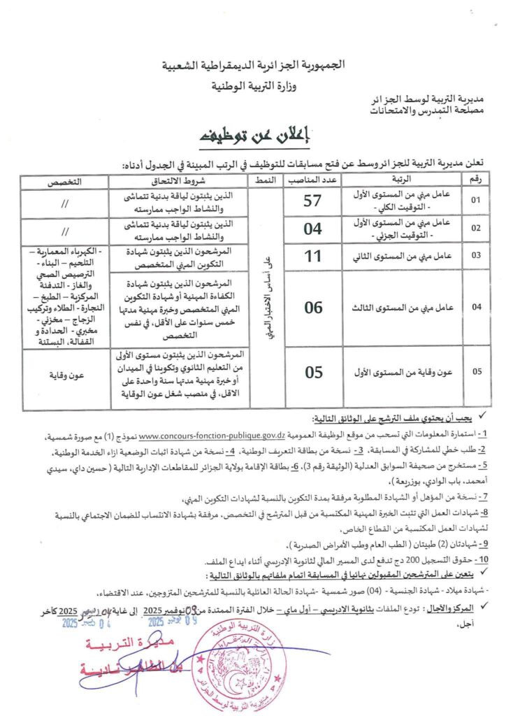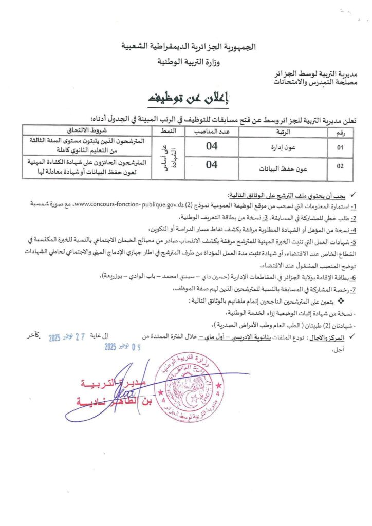 تعلن مديرية التربية للجزائر وسط عن فتح مسابقات توظيف في الرتب التالية: