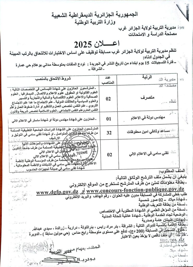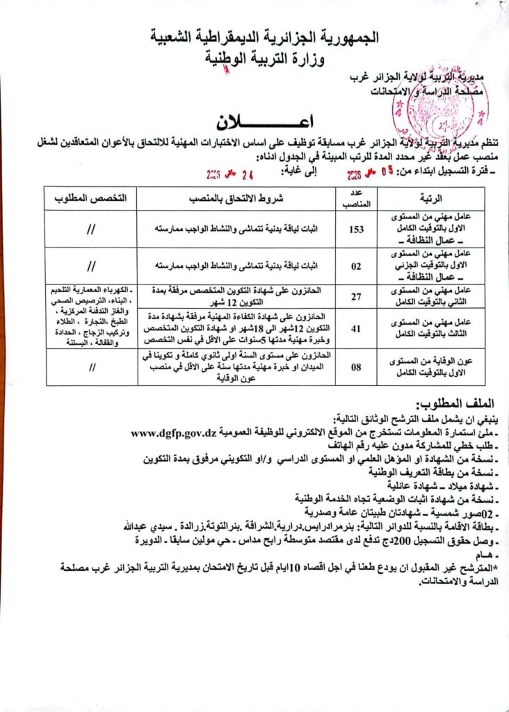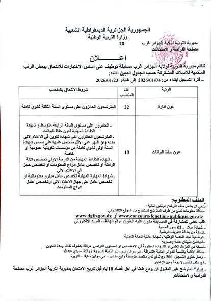 إعلان عن مسابقة توظيف على أساس الإختبارات و على أساس الإختبارات المهنية بمديرية التربية للجزائر العاصمة غرب (شرط الإقامة بإحدى الدوائر التالية : الشراقة، بئر مراد رايس، بئرتوتة، الدرارية، زرالدة و سيدي عبد الله)