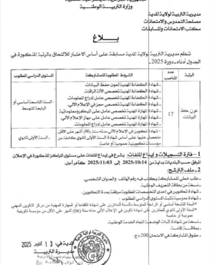 تعلن مديرية التربية لولاية المدية عن تنظيم مسابقة على أساس الاختبار للالتحاق بالرتبة التالية – دورة 2025 –: