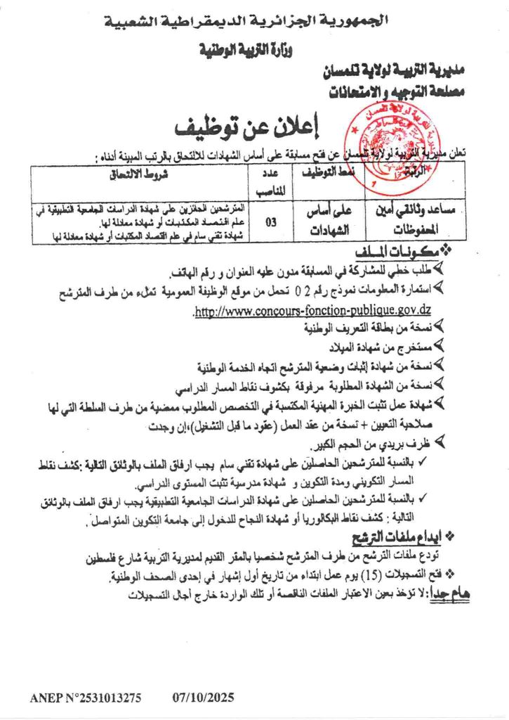 تعلن مديرية التربية لولاية تلمسان عن فتح مسابقة على أساس الشهادات للالتحاق بالرتبة التالية: