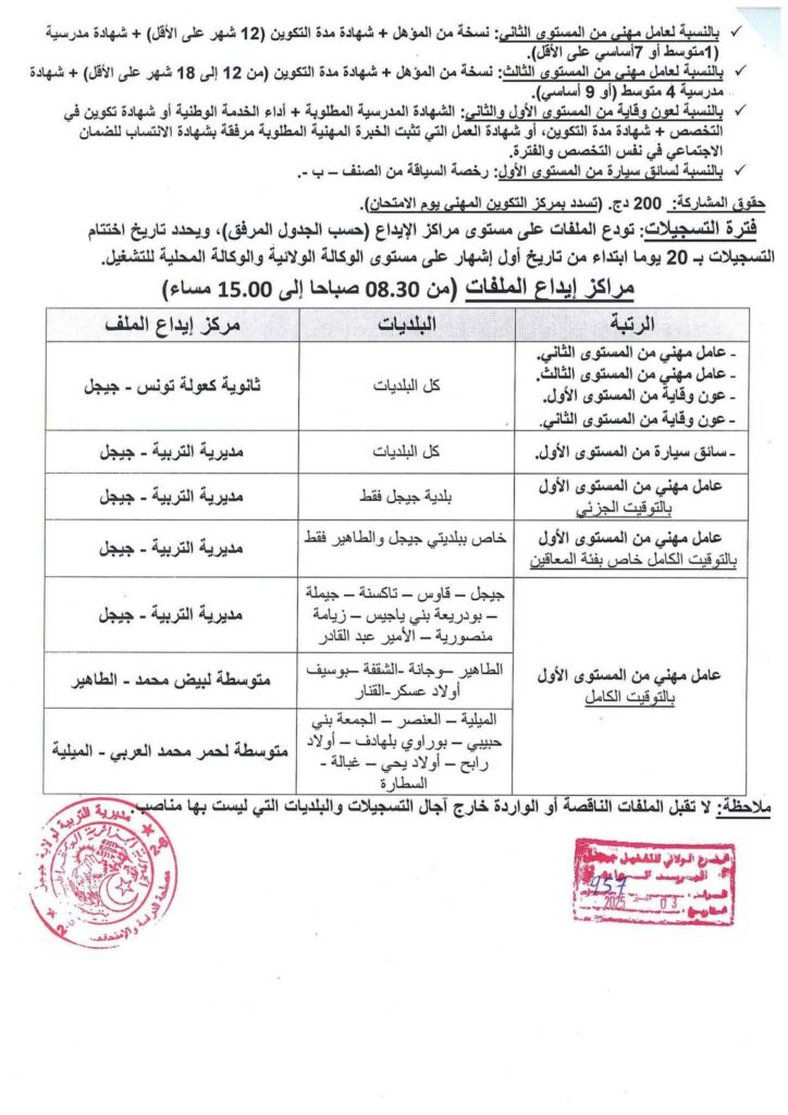 تعلن مديرية التربية لولاية جيجل عن فتح مسابقة على أساس الاختبار المهني للالتحاق بالرتب الموضحة في الجدول التالي:
