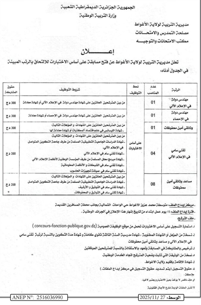تعلن مديرية التربية لولاية الأغواط عن فتح مسابقة على أساس الاختبارات للالتحاق بالرتب المبينة أدناه، بعنوان سنة 2025.
