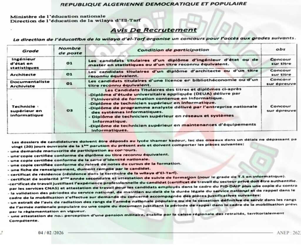 اعلان مسابقة توظيف في مديرية التربية لولاية الطارف