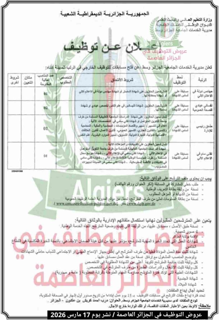 اعلان مسابقة توظيف في مديرية الخدمات الجامعية الجزائر وسط