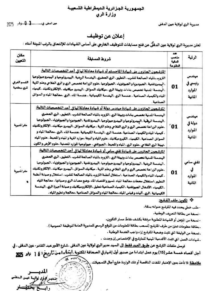 تعلن مديرية الري لولاية عين الدفلى عن فتح مسابقات للتوظيف الخارجي على أساس الشهادات للالتحاق بالرتب المبينة أدناه: