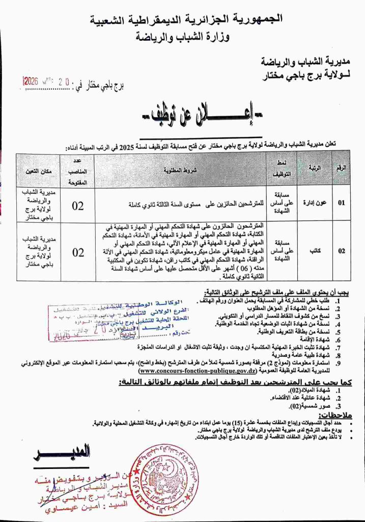 01 عون إدارة مسابقة على أساس الشهادة للمترشحين الحائزين على مستوى السنة الثالثة ثانوي كاملة. 02 مديرية الشباب والرياضة لولاية برج باجي مختار